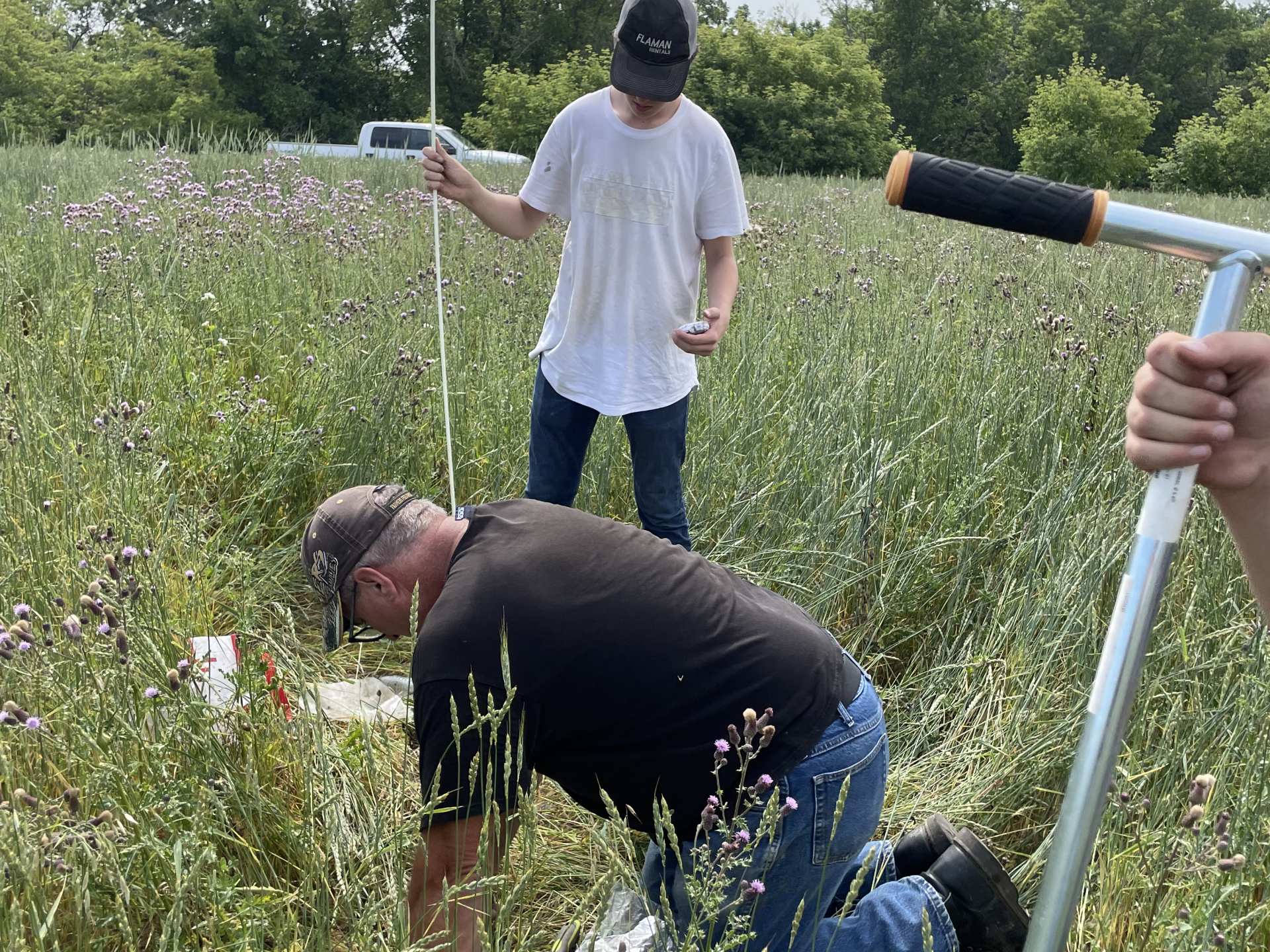 Next up, the group headed to some cropped fields to gather some results to compare to the unmanaged area. With so many hands to help out, Dan and a few of the grandkids worked on pounding water infiltration rings in to the soil, while another of the grandkids worked with Alia gathering soil core samples and penetrometer readings.