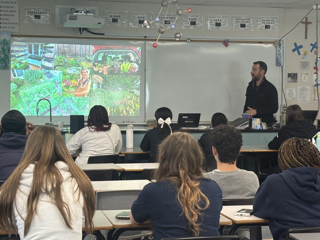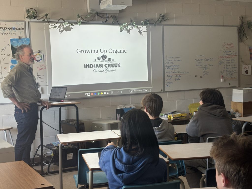 In the spring of 2025, our Growing Up Organic (GUO) program brought together two schools from the Ottawa Catholic School Board and two local organic farmers, creating a unique partnership to explore and learn about regenerative organic agriculture in the Ottawa region. Students from St. Mark’s and Immaculata High Schools welcomed producers from Roam Flora and Indian Creek Orchard Gardens in the classroom, where the guests shared their farm stories and journeys toward organic and regenerative food systems. Later in the season, the students were able to venture out of the classrooms and walk the fields of Roam Flora and Indian Creek Orchard Gardens to learn how to grow organic food and flowers while incorporating regenerative farming principles.