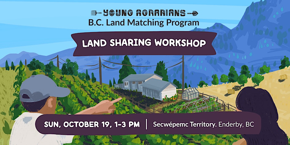 GOT LAND? WANT LAND? If you’re looking to access farmland, or are curious about sharing your land with a farmer, join us in Enderby on October 19th to start your land sharing journey with the B.C. Land Matching Program!